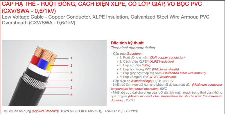Cáp điện lực hạ thế có 1 – 4 lõi, ruột đồng ép chặt, cách điện XLPE, có lớp giáp kim loại bảo vệ, vỏ bọc PVC. Mã số của sản phẩm: CU/XLPE/PV (DATA). Dây được dùng trong phân phối điện công nghiệp, lắp đặt cố định. Tiêu chuẩn áp dụng theo TCVN 5935 (EC 60502-1), TCVN 6612 (IEC 60228)